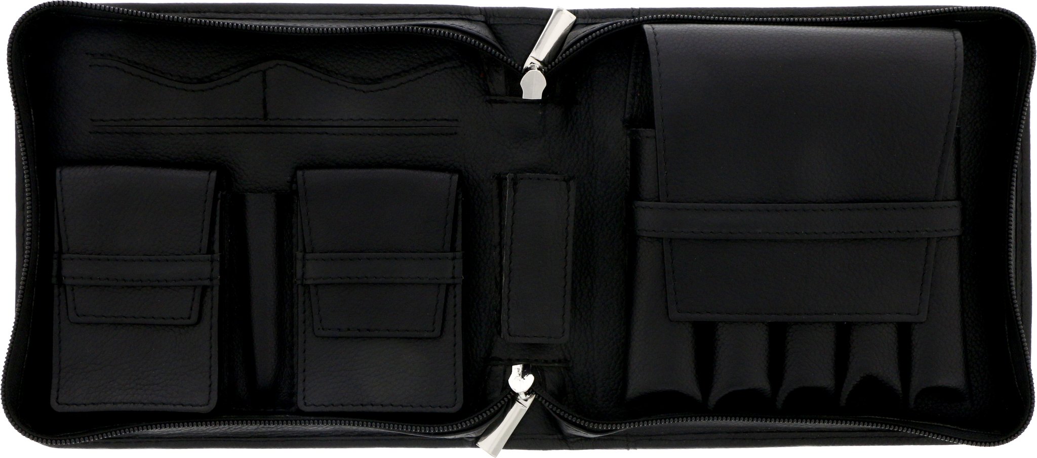 Das Cigartravelcase aus schwarzem Rindsleder für bis zu 5 Robusto ist 17,5 cm breit, 16 cm hoch und 5 cm tief.