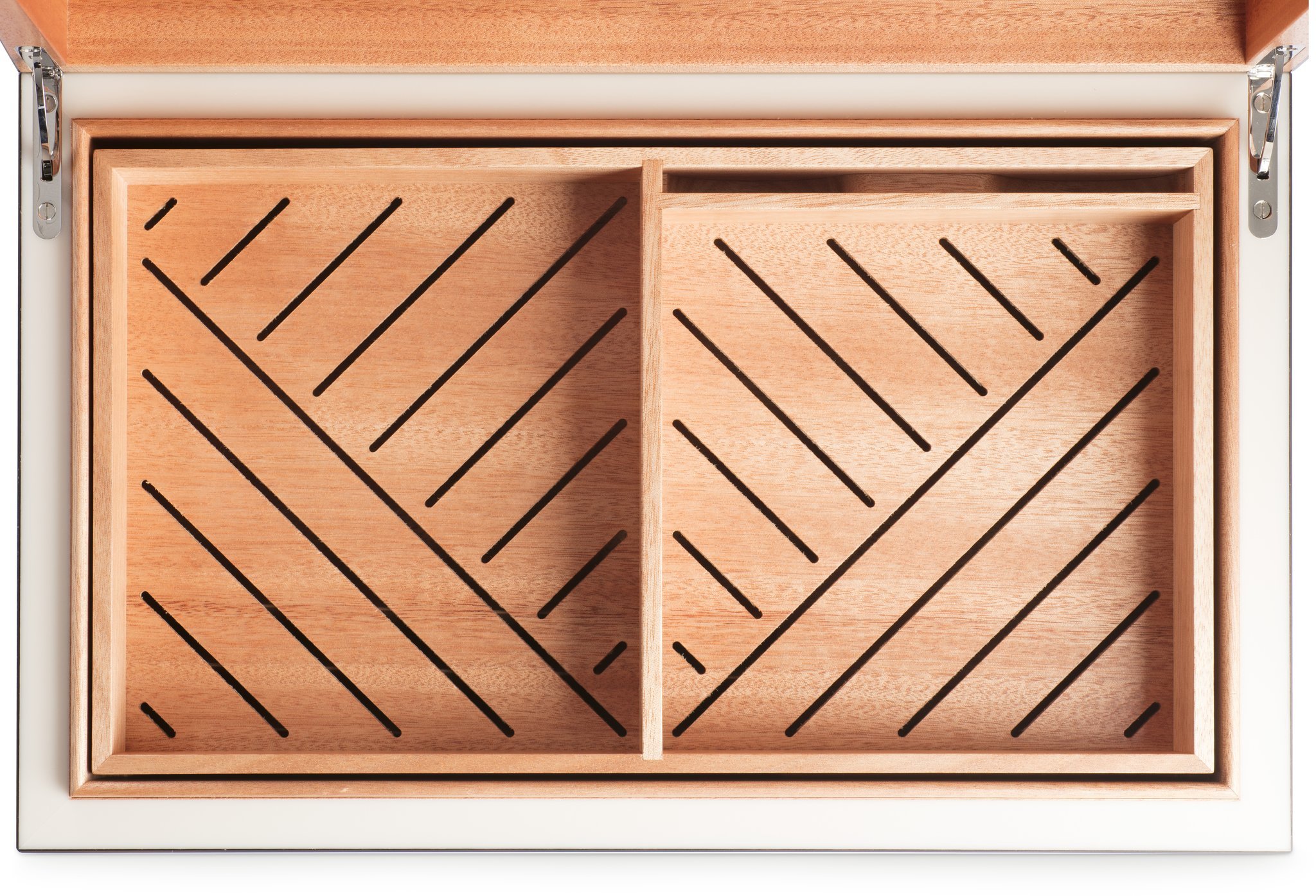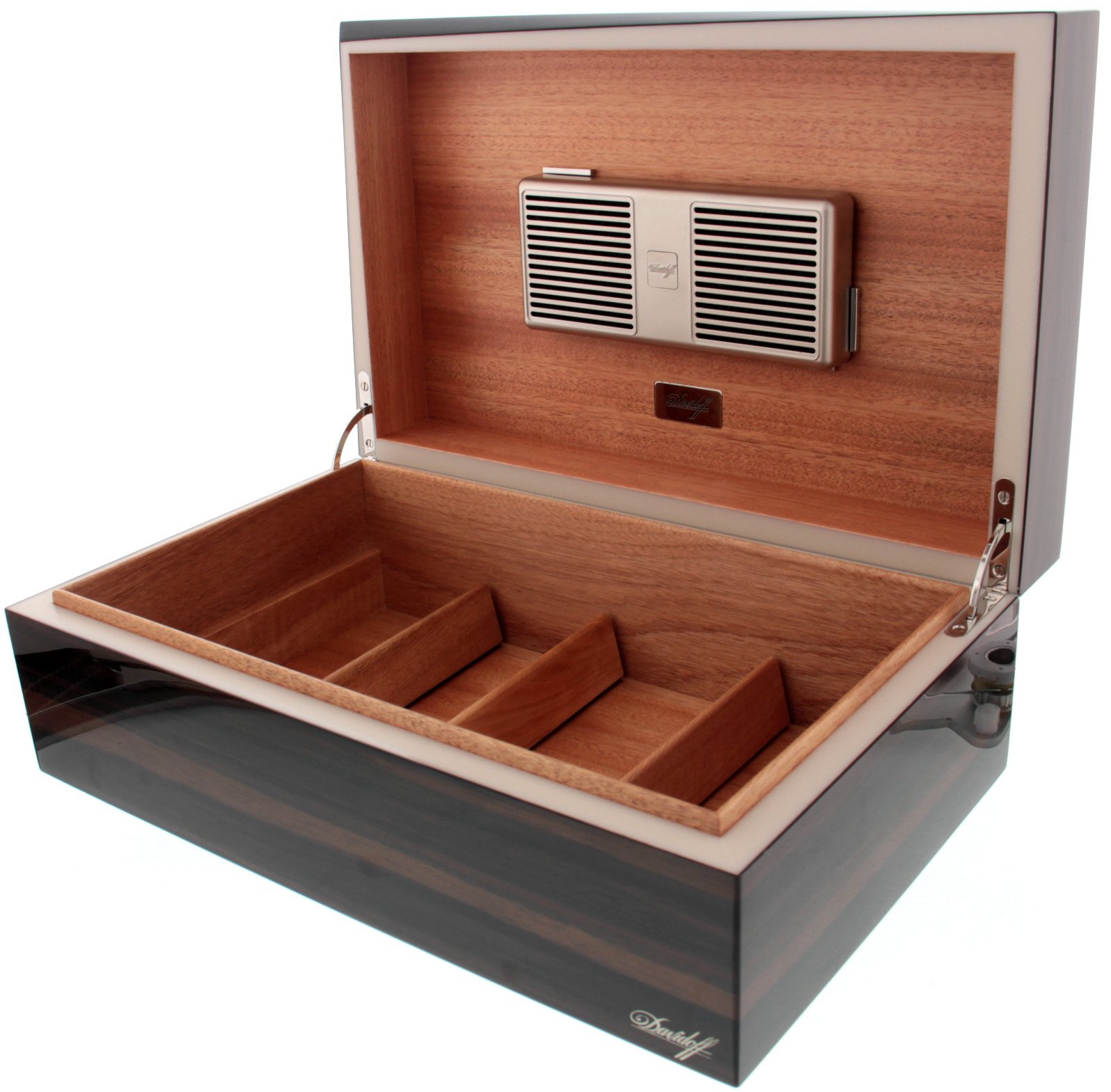 Bei diesem Ambassador Humidor von Davidoff handelt es sich um eine limitierte Edition. Der Humidor ist außen mit Macassar Holz verkleidet und einer elegant glänzenden Lackschicht überzogen. Er eignet sich für die Lagerung von 70-80 Zigarren. das Davidoff Befeuchtungssystem ist im Lieferumfang enthalten.