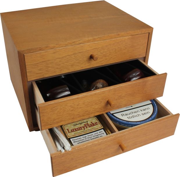 Die zwei der drei Schubladen bieten ausreichend Platz für zwölf Pfeifen, während die dritte Schublade für die Aufbewahrung von Pfeifenaccessoires und Tabak ausgelegt ist.