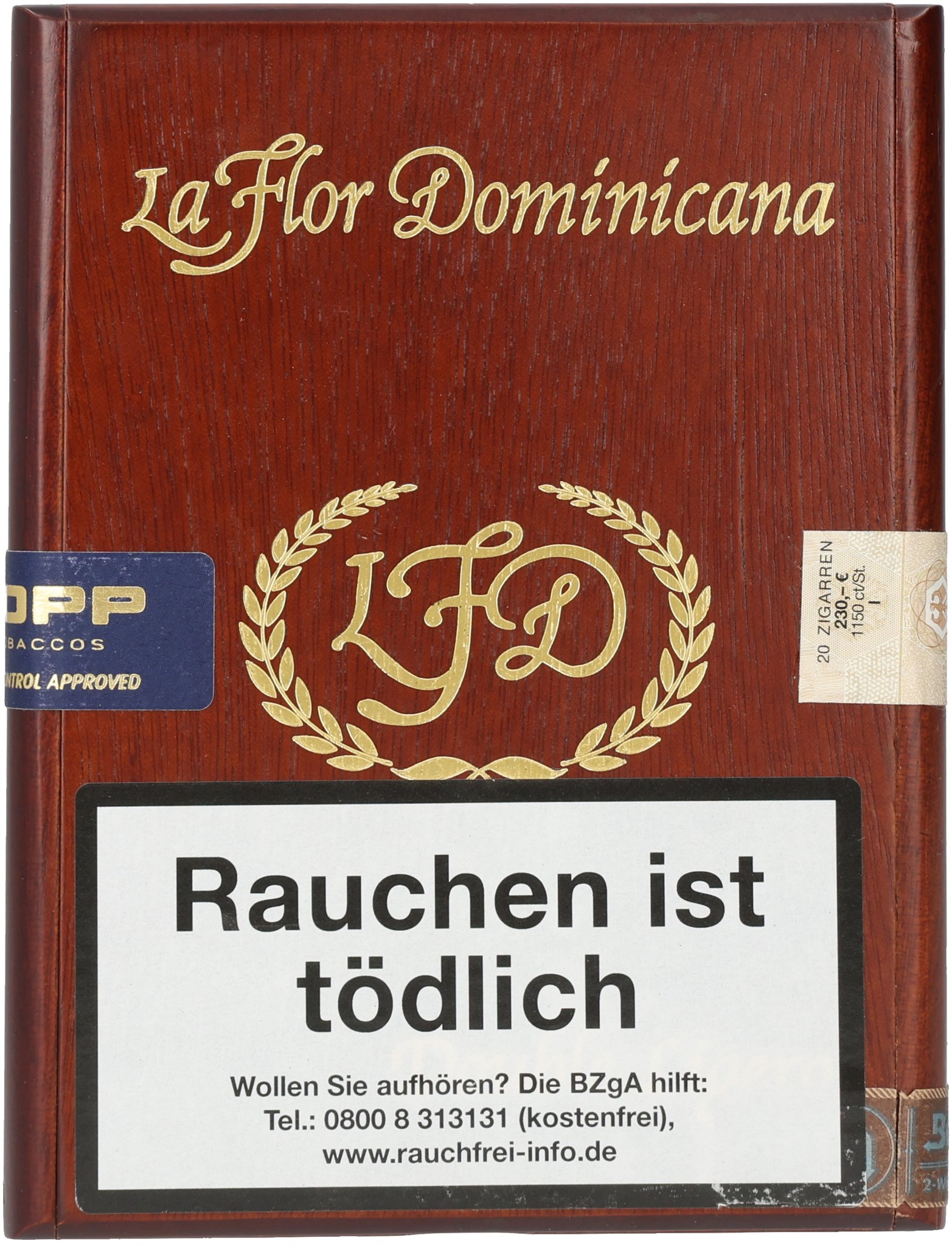 Aficionado Dom. Rep. Half Puro (Sumatra, Ecuador, Dom. Rep.) Das dunkel-braune Deckblatt mit feiner Aderung schmeckt intensiv nach Kaffee, Kakao und Gras. Der Kaltzug schmeckt cremig-nussig. Die Asche ist fest und weiß. Das Rauchvolumen ist wegen des geringen Zugwiderstandes sehr üppig. Der Abbrand ist gerade und ein längeres Ablegen ist ohne Neuanzünden möglich. Etwas Pfeffer ist im Hintergrund zu spüren, stört aber nicht den schokoladigen, kaffeeartigen Grundgeschmack. Die Asche fällt nach fast 3 cm Länge das erste Mal. Diese Vitola schmeckt auch beim Nachmittagskaffee. Im letzten Drittel kam der Pfeffer etwas stärker durch, aber Kaffee und Nussaroma waren immer noch dominanter. Preisleistungsverhältnis ist sehr gut. Das Rauchvergnügen dauerte 110 min. Preis: 7,40 €