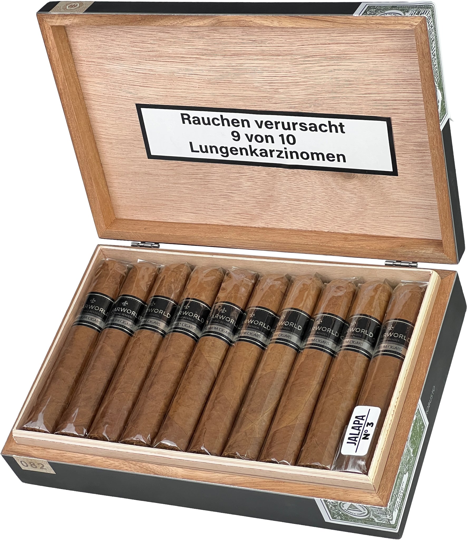 Die neue Premium Eigenmarke von Cigarworld. Es handelt sich um nicaraguanische Zigarren. Genauer handelt es sich (bislang) um drei Robustos, welche sich offiziell nur durch die Art des Ligeros in der Einlage unterscheiden: Jalapa, Condega und Esteli. Trotzdem weist jede Sorte (zumindest bei den von mir probierten Exemplaren) eine andere Deckblattfarbe auf. Die vorliegende Variante ist die Jalapa. Sie ist hochwertig verarbeitet und hat das hellste Deckblatt der Serie. Der Zugwiderstand der gleichmäßig gerollten Zigarre fällt ansprechend aus. Auch das Abbrandverhalten lässt keine Wünsche offen. Es verläuft gleichmäßig und konstant. Auch das Rauchvolumen fällt mehr als hoch genug aus. Die wichtigste Eigenschaft der mittelkräftigen bis kräftigen Zigarre ist gewiss das Geschmacksbild. Es dominieren sehr deutliche Noten von Leder, Creme und Zedernholz. Für Komplexität sorgen Noten von gerösteten Nüssen, Erde und Toast. Den letzten Schliff erhält das Geschmacksbild durch Kaffee und Gras. Auch etwas pfefferige Schärfe und eine dezente Süße sind erkennbar. Insgesamt handelt es sich um eine sehr ansprechende, etwas kräftigere Zigarre.