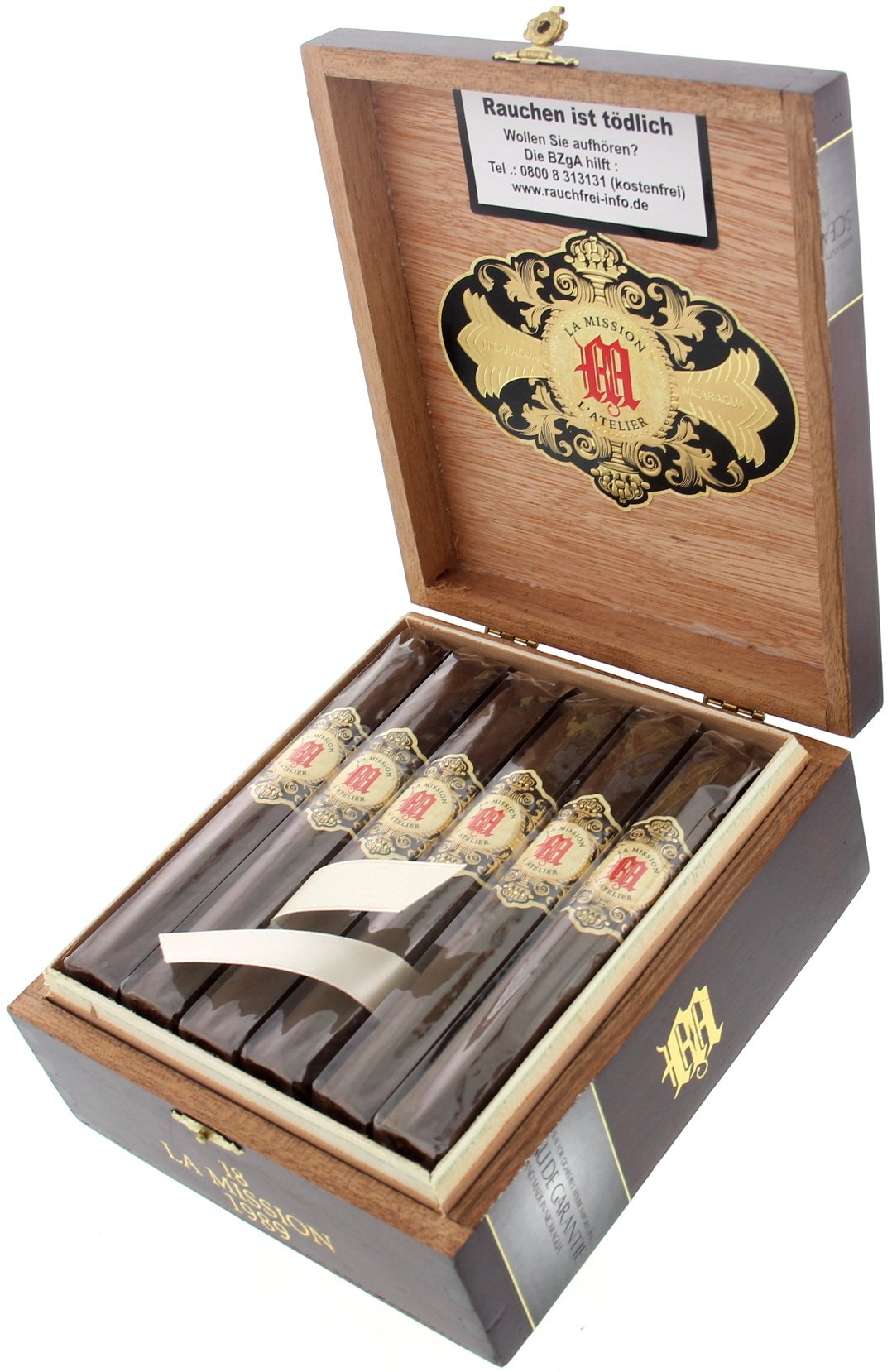 Vorweg möchte ich mich der Beschreibung dieses wundervollen Rauchvergnügens durch das Team von Cigarworld anschließen und die Warnung aussprechen: das hier ist keine Einsteigerzigarre! Die La Mission de L’Atelier 1989 ist kräftig, sehr kräftig. Aber das zeigt sie ja bereits, durch das recht fette Format. Die 5,625x54 in dem eher ovalen als eckigen boxpressed finde ich sehr ansprechend, das kleine Pigtail und die zwar fette, jedoch zurückgenommen designte Anilla runden das Erscheinungsbild toll ab. Sie wirkt rustikal, dennoch fein und wirkt dadurch ein bisschen wie die Padron des kleinen Mannes – und das macht, zumindest mir, direkt umso mehr Lust, sie zu entfachen. Das mit vielen dunklen, ja, fast schwarzen Flecken marmorierte, etwas stumpfe und leicht grau wirkende Maduro-Deckblatt ist durchzogen von vielen prominenten, aber feinen Blattadern und fühlt sich rau, haarig und erstaunlich trocken an. Sie wirkt sehr gut konstruiert, auf Druck „von oben“ gibt die 1989 gar nicht nach, „von den Seiten“ nur leicht. Kalt duftet sie tannig-süß mit Noten von trockenem Holz, Leder, dazu etwas Karamell, leicht blumige Noten und eine minzige Frische. Am Fuß erinnert das Aroma wie an einen frisch eingelassenen Dram Bunnahabhain, dazu kommt mehr von der minzigen Frische, Fazit: da ist doch Sancti Spiritus mit verdreht worden! Das kleine Pigtail erweist sich schnell als kosmetisches Gadget, einfaches Abknapsen tut es nicht, nachschneiden ist gefragt, um Zug zu kriegen – und der dann am loseren Ende von perfekt. Im Kaltzug kann man trocken tannige, ledrige und minzige Noten erahnen, dahinter etwas geröstetes Karamell – ganz klar San Andrés und Sancti Spiritus. Dezente Pfeffernoten bleiben auf Zunge und Lippen zurück. Einmal – und wirklich easy – entfacht, ist der erste Zug an der 1989 ist ein kleiner Schlag auf die Fresse. Mocca, Leder, steinige Erde, schwelendes Tannenholz, diese Sancti-Spiritus-Frische und viel Pfeffer haut die La Mission 1989 einem präsent und kantig um die Ohren, dahinter erahnbar ist eine dezente, karamellige Süße. Alles wirkt trocken, alles full bodied. Nach wenigen Zügen wirkt sie eingebundener, entweder hat sie sich aromatisch adjustiert oder man hat sich dran gewöhnt. Der Rauch wird cremiger, die karamellige Süße und die Sancti-Spiritus-Frische werden etwas präsenter und das Aromenprofil somit viel komplexer. An der Nase liegt viel Leder mit Tanne und Mocca, retronasal sind vor allem Pfeffer und Minz-Noten präsent. Bei fast fast schneeweißer und extrem loser Asche brennt die La Mission de L’Atelier 1989 gemächlich und perfekt ab. Der Rauch ist wie dichter, kaubarer Nebel – ich habe fast das Gefühl, meine eigene Hand am ausgestreckten Arm nicht mehr zu sehen – und hinterlässt einen bemerkenswert trockenen, pfeffrigen Raumduft. Im 2. Drittel wird der Rauch zunehmend cremiger, es fühlt sich fast ein bisschen so an, als würde er einen buttrigen Film im Mundraum hinterlassen; sehr angenehm. Die Noten von steiniger Erde und Tanne drängen sich in den Vordergrund, werden aber sehr gut getragen von Mocca-Noten, Leder und dieser karamelligen Süße. Retronasal geht es nun auch etwas mehr in die süßliche Richtung mit etwas Karamell; die Minz-Noten bekommen hin und wieder die Qualität von Anis. Der Abgang ist lang und zeigt vor allem Pfeffer und Gewürz-Noten. Die 1989 ist in allen Belangen voll, sozusagen ganz knapp unter Anschlag, und das vom ersten bis zum letzten Zug. Im 2. Drittel fühlt sie sich weicher an, weil alles eingebundener und süßer ist, aber das täuscht. Denn im letzten Drittel zeigt die Toro dann nochmal ihre volle Power. Erdige Noten und allerlei Pfeffer mit Chili übernehmen zunehmend das Profil, ohne wirklich überfordernd zu werden. Nach zwei Stunden ist man dann auch richtig gesättigt. Ich finde die La Mission de L’Atelier 1989 großartig, aber für mich ist sie definitiv keine Alltagszigarre. Sie ist ein Erlebnis, das ich immer wieder gerne wiederhole, am besten auf überfüllten Magen nach ordentlichem Grillgut mit einem süßen, fassstarken Single Malt.