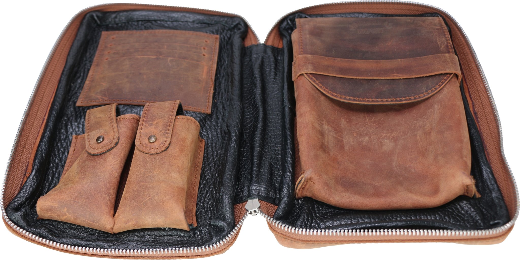 Die Zigarrentasche aus braunem Leder ist 26,5 cm lang, 17,5 cm breit und ohne Inhalt ca. 4,5 cm dick. Sie wird mit einem Metall-Reißverschluss geschlossen. Innen befinden sich neben der Tasche für die Zigarren zwei weitere Taschen für Zubehör und vier Scheckkarten-Steckplätze. Das Innenfutter ist aus weichem, schwarzem Leder. Auf der Vorderseite befindet sich noch ein weiteres Fach, welches mit einer Schnalle mittels Druckknopf geschlossen wird.