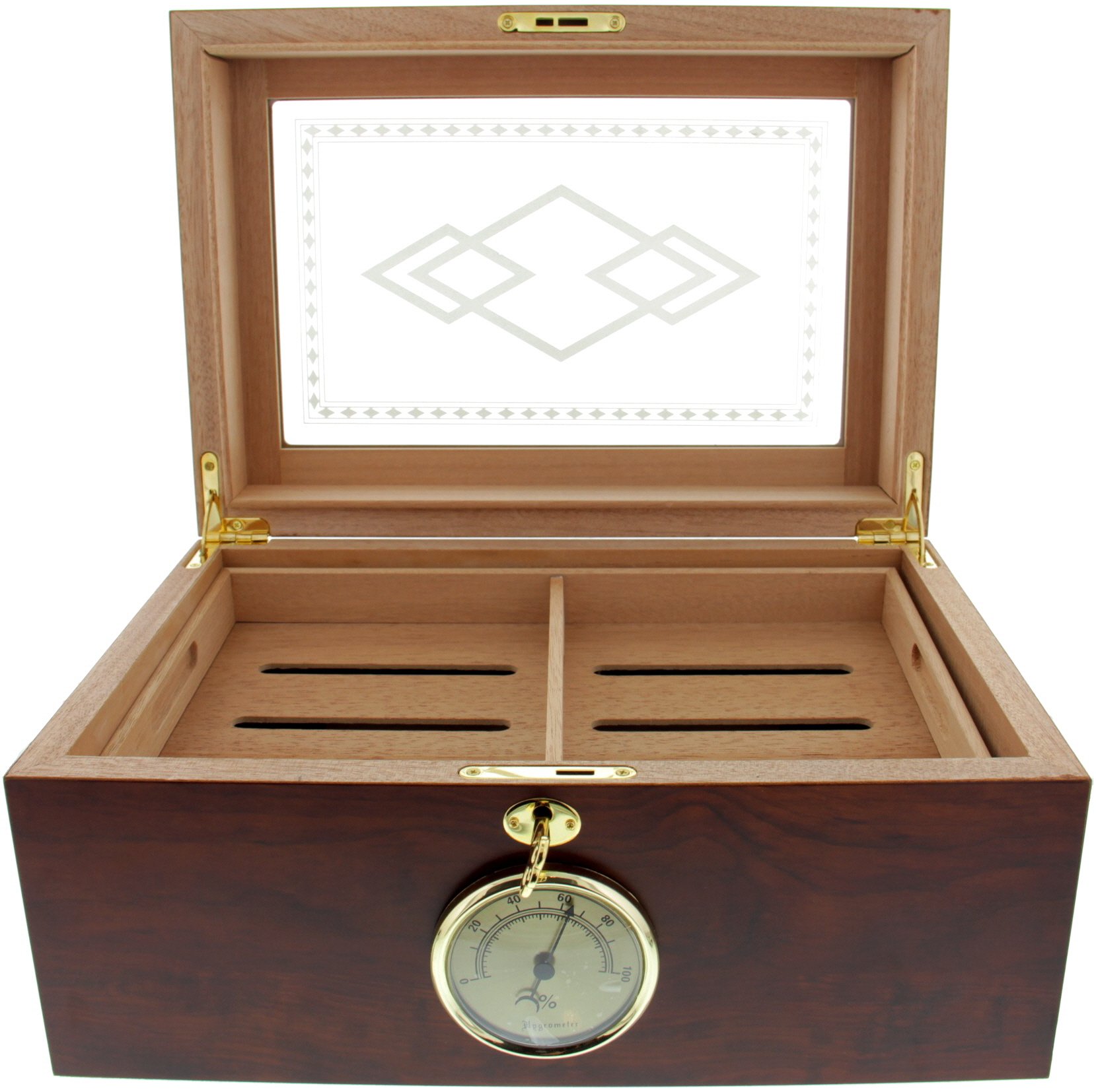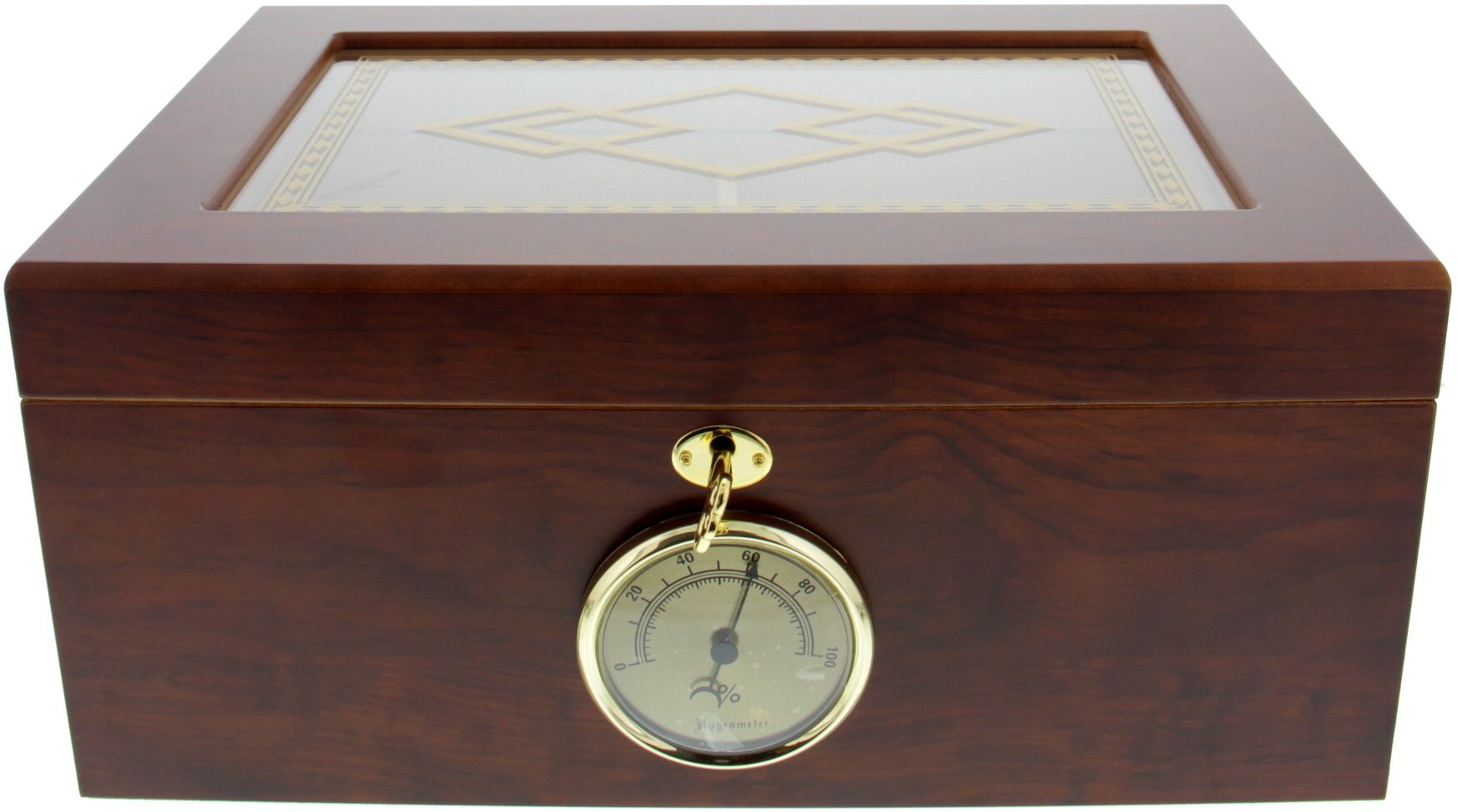 Hochwertiger Humidor in Wurzelholzoptik und einem durchsichtigen Deckel. Die Wurzelholzoptik unterstreicht die Natürlichkeit der darin gelagerten Zigarren. Je nach Format passen zwischen 35-50 Zigarren in dieses Exemplar, welches selbstverständlich mit einem selbstregulierendem Befeuchter ausgestattet ist.